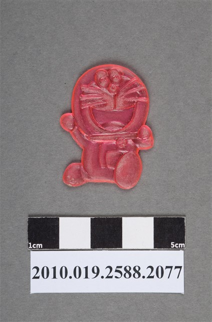 1.本物件為卡通哆啦A夢(小叮噹)之哆啦A夢尪仔仙。硬質塑膠材質,扁平,單一粉紅色,雙面浮雕圖案,兩面圖案相同。圖案為正在走路的哆啦A夢,左右臉頰上各有3根鬚,張嘴而笑,可見其脖子上有鈴鐺,肚子上有百寶袋,其雙手舉起,呈興高采烈走路貌。