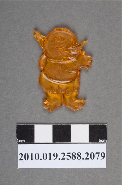 1.本物件為橙色人型尪仔仙。硬質塑膠材質,扁平,單一橙色,雙面浮雕圖案。正面圖案為站立孩童人型,有尖型大耳,張嘴笑,可見牙齒與舌頭,肚子微凸,僅下半身有裙狀衣物,手腳掌為蹼狀。