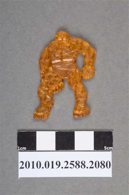 1.本物件為握拳人型尪仔仙。硬質塑膠材質,扁平,單一橙色,雙面浮雕圖案。正面圖案為彎腰站立人型,雙手握拳,身上有塊狀紋路,似石頭裂紋。