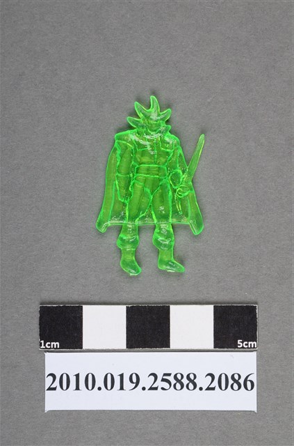 1.本物件為持劍人型尪仔仙。硬質塑膠材質,扁平,單一綠色,雙面浮雕圖案。正面圖案為站立人型,頭部有放射狀裝飾或髮型,服裝有披風,一手自然垂下, 手拿著劍型武器。
