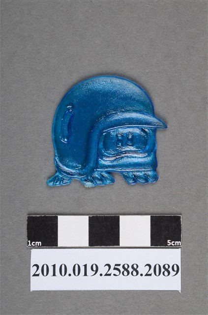 1.本物件為安全帽型尪仔仙。硬質塑膠材質,扁平,單一藍色,雙面浮雕圖案,兩面圖案相同。圖案為戴著安全帽的生物,身體被罩在安全帽內,露出眼部和足部。