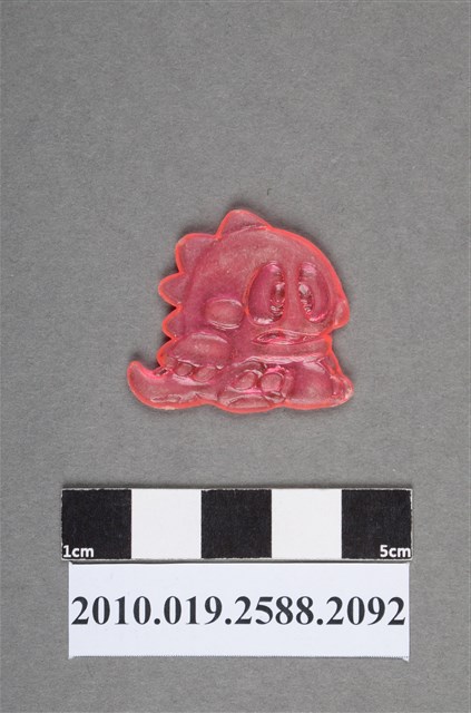 1.本物件為電玩泡泡龍的同名尪仔仙。硬質塑膠材質,扁平,單一粉紅色,雙面浮雕圖案,兩面圖案相同。圖案為坐著的恐龍,可見腳底,背上有三角形骨質板,延伸至尾巴,嘴巴微開,有門牙,表情呈委屈貌。