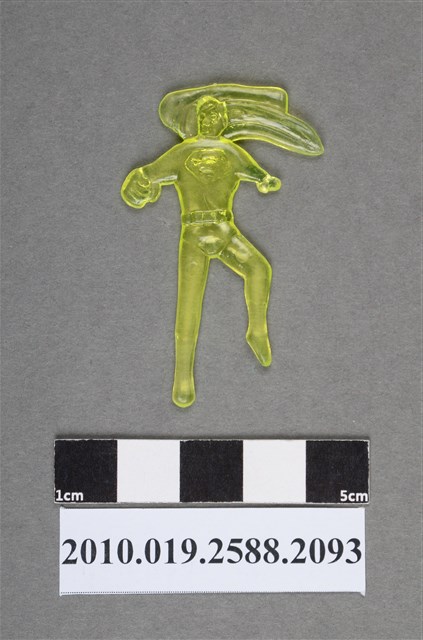 1.本物件為超人尪仔仙。硬質塑膠材質,扁平,單一黃色,雙面浮雕圖案。正面圖案為超人穿著披風和超人裝,披風揚起,胸前有S字,雙手握拳,左拳往前擊,右腳抬起。
