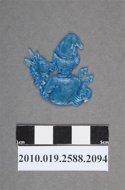 1.本物件為抱獨角獸人型尪仔仙。硬質塑膠材質,扁平,單一藍色,雙面浮雕圖案。正面圖案為半身人像抱著動物,其頭戴尖帽子和眼鏡,雙手抱著動物,動物4腳朝上,動物看似為獨角獸,因為頸部有鬃毛,頭頂有螺旋角。