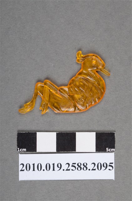 1.本物件為橙色鳥型尪仔仙。硬質塑膠材質,扁平,單一橙色,雙面浮雕圖案,兩面圖案相同。圖案為擬人化鳥兒,後腦杓有一撮羽毛翹起,翅膀似雙手在插腰,雙腳有關節,呈彎曲狀。