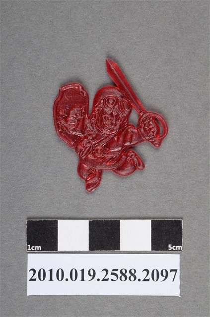 1.本物件為持劍盾人型尪仔仙。硬質塑膠材質,扁平,單一不透明紅色,雙面浮雕圖案,兩面圖案相同。圖案為戰鬥的人型,其頭戴安全帽,安全帽上有飛行眼鏡,身穿大外套,斜揹某物,一手拿盾牌,一手舉著長劍,雙腳有跳躍貌。