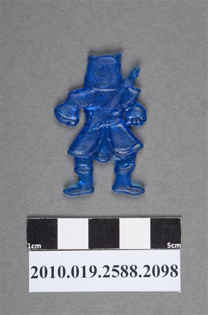 1.本物件為握拳人型尪仔仙。硬質塑膠材質,扁平,單一藍色,雙面浮雕圖案。正面圖案為穿著戰鬥裝備的人型,頭戴頭盔,頭盔前額處有V字型,身穿鎧甲,背後揹有1把刀,腳踏靴子,其兩手握拳,一拳朝上,一拳朝下。