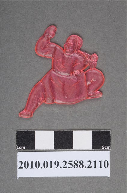 1.本物件為漫畫七龍珠之桃白白尪仔仙。硬質塑膠材質,扁平,單一粉紅色,雙面浮雕圖案。正面圖案為擺出武功姿勢的桃白白,有長辮子,長袍上有「殺」字樣,其左手往上舉,左腳伸出,右腳彎曲。在漫畫中為反派角色。