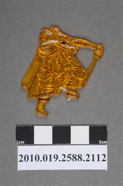 1.本物件為漫畫諸葛四郎之龍頭尪仔仙。硬質塑膠材質,扁平,單一橙色,雙面浮雕圖案。正面圖案為龍頭人身,嘴巴張開,服裝為古代風格,披有披風,左手往前伸,右手拿著刀,左腳伸直,右腳彎曲。在漫畫中,龍頭為武功高強的反派角色。