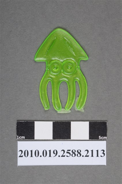1.本物件為電玩超級瑪利歐兄弟(超級瑪利)之魷魚(烏賊)尪仔仙。硬質塑膠材質,扁平,單一綠色,雙面浮雕圖案,兩面圖案相同。圖案為4隻觸手的Q版軟體動物,型體較像魷魚,尾端的鰭呈三角形狀,有大眼睛。在遊戲設定中,大多出沒於水中關卡,以接觸方式攻擊玩家。
