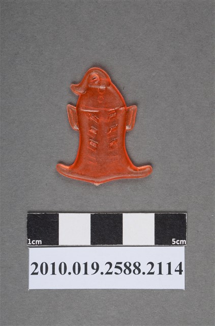 1.本物件為頭盔頭像尪仔仙。硬質塑膠材質,扁平,單一橘色,雙面浮雕圖案。正面圖案為戴面具型頭盔遮住全頭部,頭盔造型延伸至脖子,頭盔頂上有一截物品,眼睛底下有6條斜紋之頭像。