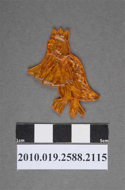 1.本物件為橙色鳥型尪仔仙。硬質塑膠材質,扁平,單一橙色,雙面浮雕圖案。正面圖案為擬人化之鳥型,戴著眼鏡,頭頂有山型構造,鳥喙長,以雙腳站立,翅膀一收一張。