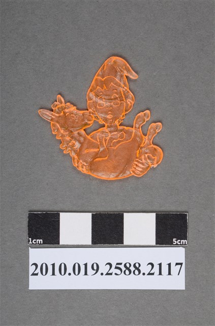 1.本物件為抱獨角獸人型尪仔仙。硬質塑膠材質,扁平,單一橘色,雙面浮雕圖案。正面圖案為半身人像抱著動物,其頭戴尖帽子和眼鏡,雙手抱著動物,動物4腳朝上,動物看似為獨角獸,因為頸部有鬃毛,頭頂有螺旋角。尪仔仙有破損,頭頂角斷掉,只剩底部。