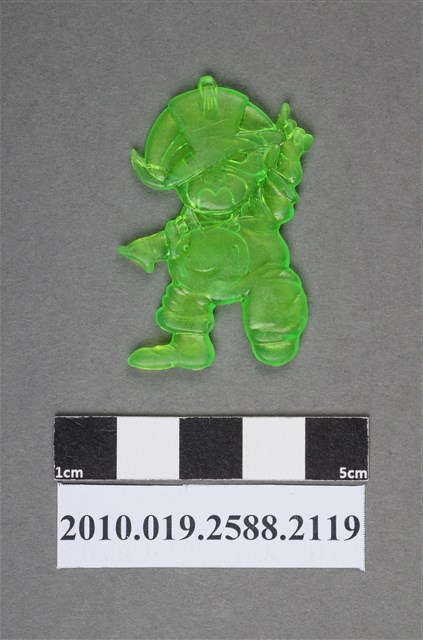 1.本物件為戴帽人型尪仔仙。硬質塑膠材質,扁平,單一綠色,雙面浮雕圖案。正面圖案為單腳站立的小孩,戴著帽子,有尖耳,張嘴可見牙齒和舌頭,左手往旁邊伸,右手比出食指往上伸,以左腳站立,右腳抬起。