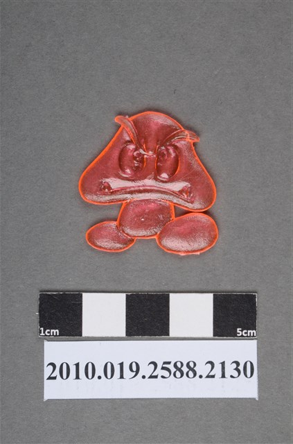 1.本物件為電玩超級瑪利歐兄弟(超級瑪利)之毒蘑菇(毒香菇)尪仔仙。硬質塑膠材質,扁平,單一粉橘色,雙面浮雕圖案,兩面圖案相同。圖案為擬人化的毒蘑菇,蕈傘表面有眉毛、眼睛、嘴巴和尖牙齒,有橢圓形腳,無手。毒蘑菇是超級瑪利歐兄弟電玩系列中經典的敵人之一。