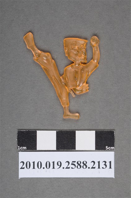 1.本物件為功夫人型尪仔仙。硬質塑膠材質,扁平,單一綠色,雙面浮雕圖案,兩面圖案相同。圖案為以單腳站立的男性,其一手握拳舉起,另一手放於腹部前,一腳站立,另一隻腳拉直抬起,腳掌超過頭部。2.尪仔仙尺寸大致可分成小、中、大型,小型約長2-5公分,中型約長8-15公分,顏色以單色為主。有些大型的則可長達30公分左右,以菩薩、神仙和民間傳說故事人物等造型為主,塗上金銀紅黃彩漆等亮色。1960、70年代的尪仔仙多以民間傳說故事、歌仔戲、布袋戲人物為造型。1980年代改以卡通、電玩、漫畫人物造型為主。常見玩法之一為兩人(或多人)各持一只尪仔仙,輪流用手指彈射,看誰的尪仔仙先疊在對方上面,便可贏得對方用來對戰或是約定的尪仔仙。