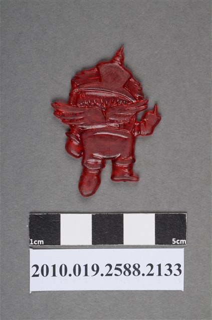 1.本物件為吊帶褲人型尪仔仙。硬質塑膠材質,扁平,單一紅色,雙面浮雕圖案。正面圖案為穿著吊帶褲的小孩,帶有頭冠,正中央有1隻螺旋角,吊帶褲中間有個口袋,一手舉起,比出中指,一手自然垂下,背後有1對翅膀。