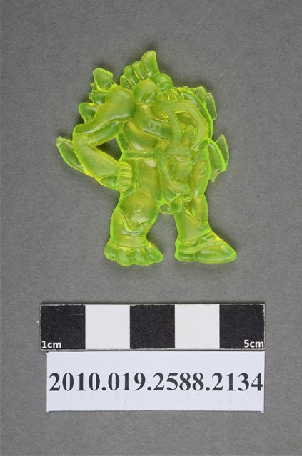 1.本物件為黃色機器人型尪仔仙。硬質塑膠材質,扁平,單一黃色,接近螢光綠色,雙面浮雕圖案,兩面圖案相同。圖案為站立的機器人型,一手插腰,手臂上有鋸齒狀造型。