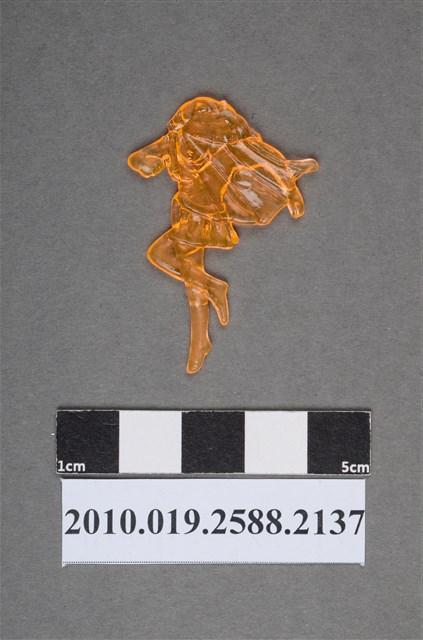 1.本物件為披風人型尪仔仙。硬質塑膠材質,扁平,單一橘色,雙面浮雕圖案。正面圖案為單腳站立的女性,穿有披風,略有揚起,胸前有S字,其左手握拳彎肘,右手向後擺,左腳站立,右膝蓋彎曲,為女超人形象。