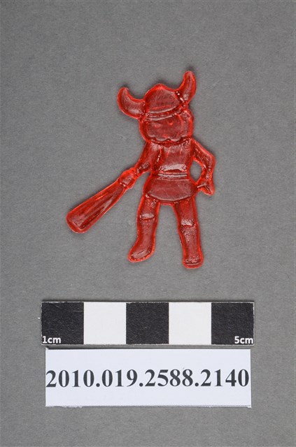 1.本物件為卡通北海小英雄之小威尪仔仙。硬質塑膠材質,扁平,單一紅色,雙面浮雕圖案。正面圖案為頭戴維京人帽子,腳穿靴子,左手拿棒子之男孩貌。