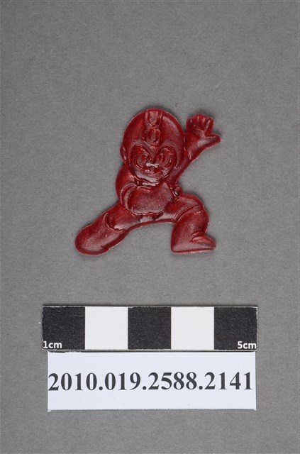 1.本物件為電玩洛克人之洛克人尪仔仙。硬質塑膠材質,扁平,單一不透明紅色,雙面浮雕圖案,兩面圖案相同。圖案為戴著頭盔的洛克人呈戰鬥姿勢,一手向後伸,一手握拳在胸前,一腳向後伸,一腳膝蓋往前彎曲。