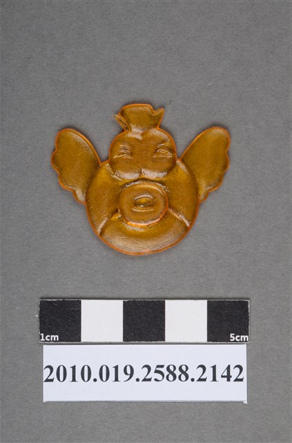 1.本物件為橙色魚型尪仔仙。硬質塑膠材質,扁平,單一橙色,雙面浮雕圖案,兩面圖案相同。圖案為魚與雞型結合的生物正面,頭上有冠,眼睛大,嘴唇厚,身體兩側有似魚鰭或翅膀構造,無腳。