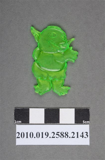 1.本物件為綠色人型尪仔仙。硬質塑膠材質,扁平,單一綠色,雙面浮雕圖案。正面圖案為站立孩童人型,有尖型大耳,張嘴笑,可見牙齒與舌頭,肚子微凸,僅下半身有裙狀衣物,手腳掌為蹼狀。