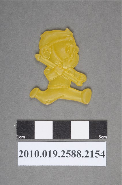 1.本物件為孫悟空尪仔仙。硬質塑膠材質,扁平,單一不透明黃色,雙面浮雕圖案,兩面圖案相同。圖案為Q版頭戴金箍的孫悟空,肩上扛著金箍棒,呈跑步姿勢。孫悟空為西遊記之角色。