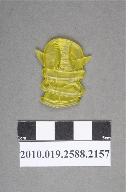 1.本物件為頭盔頭像尪仔仙。硬質塑膠材質,扁平,單一黃色,雙面浮雕圖案。正面圖案為戴著面具型頭盔遮住全頭部,兩側太陽穴有突出尖角裝飾,橫型構件蓋住臉頰和鼻子之包括脖子部分頭像。