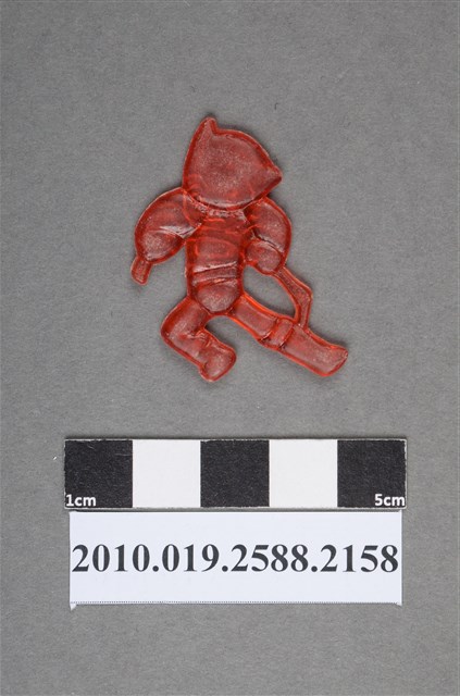 1.本物件為漫畫原子小金剛之小金剛尪仔仙。硬質塑膠材質,扁平,單一紅色,雙面浮雕圖案。正面圖案為頭部有尖角造型的小金剛,裝扮有腰帶和靴子,其表情生氣,雙手在折棍型物品。