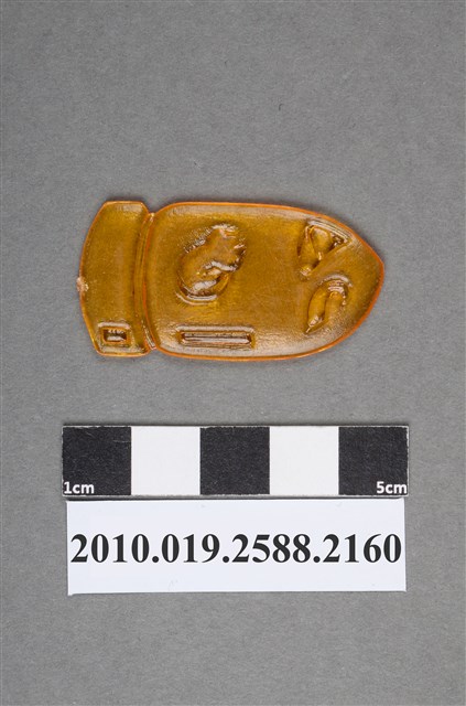 1.本物件為電玩超級瑪利歐兄弟(超級瑪利)之水中砲彈(魚雷)尪仔仙。硬質塑膠材質,扁平,單一橙色,雙面浮雕圖案,兩面圖案相同。圖案為擬人化水中砲彈,前端有眼睛和嘴巴,彈身上有手,呈握拳姿勢。在遊戲設定中,玩家要閃躲水中砲彈。