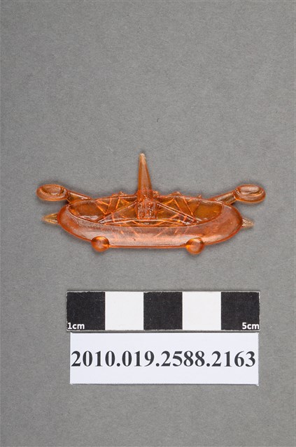 1.本物件為飛行器尪仔仙。硬質塑膠材質,扁平,單一橙色,雙面浮雕圖案。正面圖案為橢圓形飛行器,飛行器正中間有牛臉,頭上有牛角,頭頂正上方有錐形物,飛行器左右有尖角以及橢圓盤狀設備。
