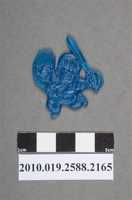 1.本物件為持劍盾人型尪仔仙。硬質塑膠材質,扁平,單一藍色,雙面浮雕圖案,兩面圖案相同。圖案為戰鬥的人型,其頭戴安全帽,安全帽上有飛行眼鏡,身穿大外套,斜揹某物,一手拿盾牌,一手舉著長劍,雙腳有跳躍貌。