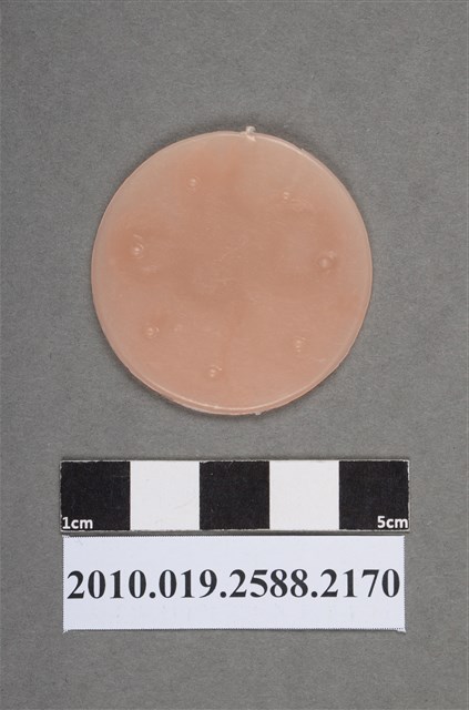 1.本物件為飛龍圓形尪仔仙。硬質塑膠材質,扁平,單一藕色,單面浮雕圖案。底部為圓形,上有龍樣浮雕,龍身彎曲,停在空中,可見其龍鬚、鱗片、龍爪和龍角等。
