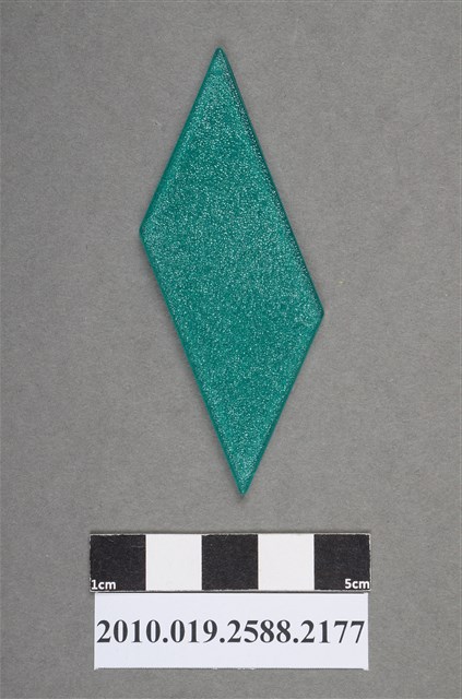 2.藏品登錄號2010.019.2588.2174-2010.019.2588.2183為相似物件,是同顏色但不同形狀的塑膠片,推測可能為七巧板的組合物件。七巧板屬於益智幾何遊戲,將正方形分割成7塊基本圖形,有正方形、三角形和平行四邊形,基本圖形的每個角都是45度角的倍數,遊戲者再將基本圖形拼成其他有趣圖形。