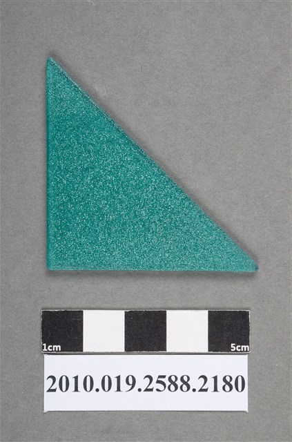 2.藏品登錄號2010.019.2588.2174-2010.019.2588.2183為相似物件,是同顏色但不同形狀的塑膠片,推測可能為七巧板的組合物件。七巧板屬於益智幾何遊戲,將正方形分割成7塊基本圖形,有正方形、三角形和平行四邊形,基本圖形的每個角都是45度角的倍數,遊戲者再將基本圖形拼成其他有趣圖形。