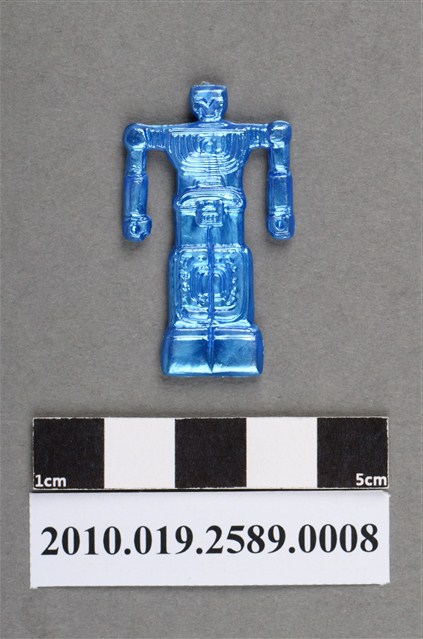 1.本物件為卡通雷霆王之萊機器人尪仔仙。硬質塑膠材質,扁平,單一不透明藍色,雙面浮雕圖案,兩面圖案相同。圖案為站立機器人,頭小身大,頭型為方型,胸前有數條線條圖案和1個圓圈。肩膀明顯,雙手呈拳狀,雙腳併攏。