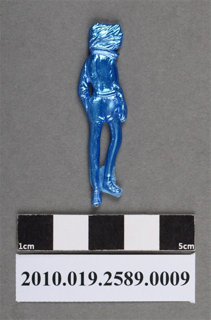 1.本物件為藍色人型尪仔仙。硬質塑膠材質,扁平,單一不透明藍色,雙面浮雕圖案。正面圖案為站立男性,上半身套有外衣,領子立起,腰間有腰帶,雙手垂下。