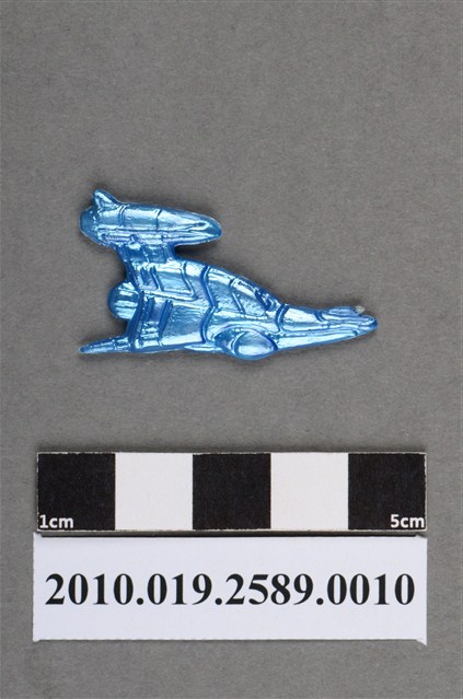 1.本物件為太空梭尪仔仙。硬質塑膠材質,扁平,單一不透明藍色,雙面浮雕圖案,兩面圖案相同。圖案為太空梭,有駕駛艙,梭尾有噴射器,太空梭後半部頂架有似橢圓形物體,尾端上方有垂直翼面。