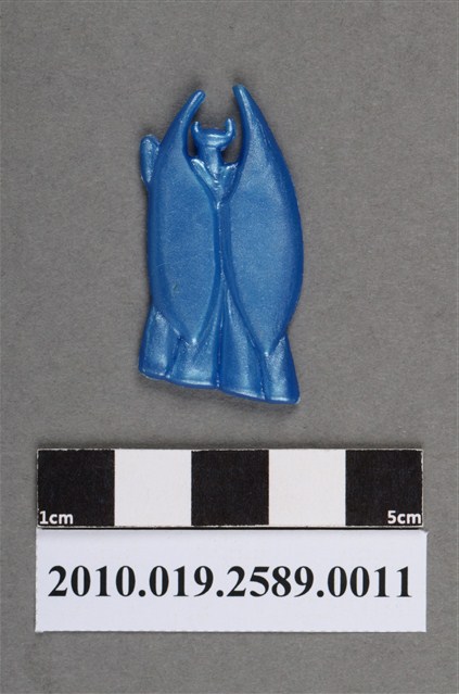 1.本物件為藍色人型尪仔仙。硬質塑膠材質,扁平,單一不透明藍色,雙面浮雕圖案。正面圖案為站立人型,頭上有2支角狀物,背後有2片似翅膀或是裝飾品的東西,下半身服裝為裙裝,雙手往上舉。