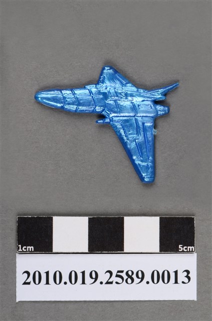 1.本物件為飛機尪仔仙。硬質塑膠材質,扁平,單一不透明藍色,雙面浮雕圖案,兩面圖案相同。圖案為飛機斜側面,機翼靠近機身處有凸出尖狀物,飛機後方有尾翼和噴射器。