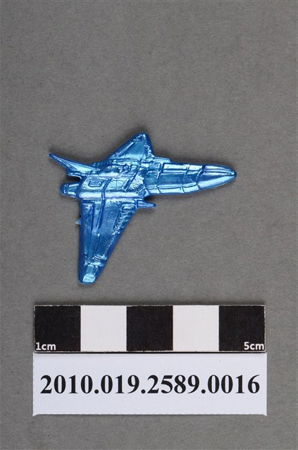 1.本物件為飛機尪仔仙。硬質塑膠材質,扁平,單一不透明藍色,雙面浮雕圖案,兩面圖案相同。圖案為飛機斜側面,機翼靠近機身處有凸出尖狀物,飛機後方有尾翼和噴射器。