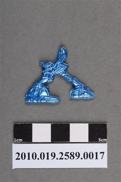 1.本物件為藍色尪仔仙。硬質塑膠材質,扁平,單一不透明藍色,雙面浮雕圖案,兩面圖案相同。圖案似機械腳,僅有下半身,雙腳交接上方有翹起來的物件。