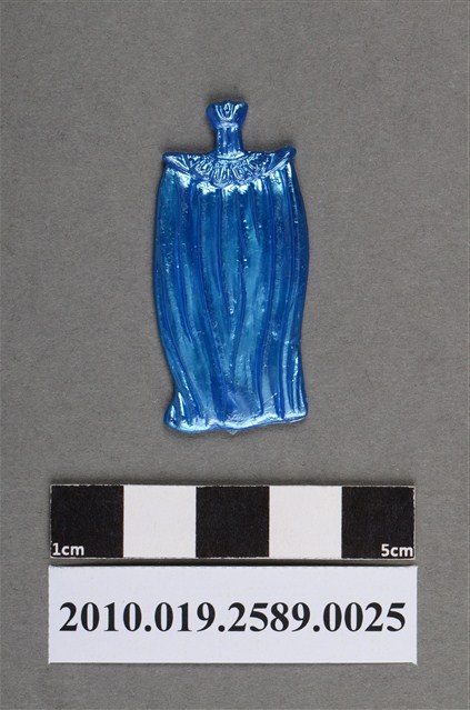 1.本物件為藍色人型尪仔仙。硬質塑膠材質,扁平,單一不透明藍色,雙面浮雕圖案。正面圖案為站立人型,頭上有皇冠狀物品,脖子以下被袍子罩住,看不到身軀和四肢,胸前有裝飾物。