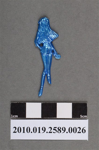 1.本物件為插腰人型尪仔仙。硬質塑膠材質,扁平,單一不透明藍色,雙面浮雕圖案。正面圖案為站立女性人型,長髮,髮長至腰部,腰間有腰帶,左手插腰,右手垂放。尪仔仙有破裂,右腳斷掉。