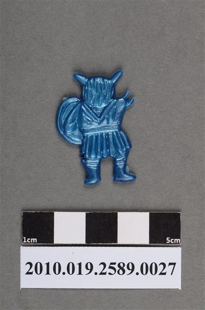 1.本物件為持盾人型尪仔仙。硬質塑膠材質,扁平,單一不透明藍色,雙面浮雕圖案。正面圖案為站立男性,頭上有2支角狀物,肩膀上亦有角狀物,下半身有裙狀服飾,雙手拿著盾牌,膝蓋上有角狀物構件。