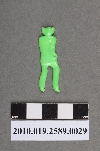 1.本物件為綠色人型尪仔仙。硬質塑膠材質,扁平,單一不透明綠色,雙面浮雕圖案。正面圖案為男性人型,其髮型在頭部左右呈扇形,身穿外套,左手微彎,兩腳膝蓋微彎,似走路貌。