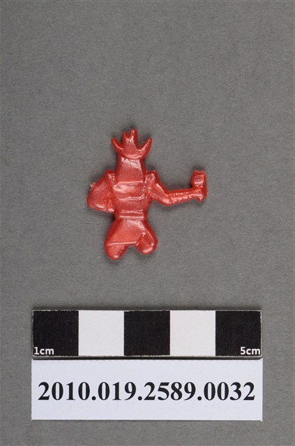 1.本物件為持槌人型尪仔仙。硬質塑膠材質,扁平,單一不透明紅色,雙面浮雕圖案。正面圖案為人型,身穿戰甲,頭戴光芒狀頭盔,右手舉著槌型武器,左手彎曲於腹部,呈戰鬥姿勢。比對藏品登錄號2010.019.2588.1502,此尪仔仙沒有下半身。2.尪仔仙尺寸大致可分成小、中、大型,小型約長2-5公分,中型約長8-15公分,顏色以單色為主。有些大型的則可長達30公分左右,以菩薩、神仙和民間傳說故事人物等造型為主,塗上金銀紅黃彩漆等亮色。1960、70年代的尪仔仙多以民間傳說故事、歌仔戲、布袋戲人物為造型。1980年代改以卡通、電玩、漫畫人物造型為主。常見玩法之一為兩人(或多人)各持一只尪仔仙,輪流用手指彈射,看誰的尪仔仙先疊在對方上面,便可贏得對方用來對戰或是約定的尪仔仙。