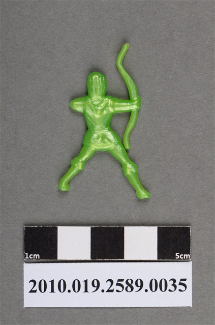 1.本物件為持弓人型尪仔仙。硬質塑膠材質,扁平,單一不透明綠色,雙面浮雕圖案。正面圖案為站立人型,一手拿著弓箭,一手彎曲,作出拉弓姿勢,背後有V字型領口裝飾,雙腳跨開。2.尪仔仙尺寸大致可分成小、中、大型,小型約長2-5公分,中型約長8-15公分,顏色以單色為主。有些大型的則可長達30公分左右,以菩薩、神仙和民間傳說故事人物等造型為主,塗上金銀紅黃彩漆等亮色。1960、70年代的尪仔仙多以民間傳說故事、歌仔戲、布袋戲人物為造型。1980年代改以卡通、電玩、漫畫人物造型為主。常見玩法之一為兩人(或多人)各持一只尪仔仙,輪流用手指彈射,看誰的尪仔仙先疊在對方上面,便可贏得對方用來對戰或是約定的尪仔仙。