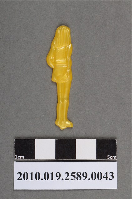 1.本物件為黃色抱頭盔人型尪仔仙。硬質塑膠材質,扁平,單一不透明黃色,雙面浮雕圖案。正面圖案為站立女性,髮長至肩,身穿裙裝,繫有腰帶,左手抱著頭盔,頭盔表面有紋路。2.尪仔仙尺寸大致可分成小、中、大型,小型約長2-5公分,中型約長8-15公分,顏色以單色為主。有些大型的則可長達30公分左右,以菩薩、神仙和民間傳說故事人物等造型為主,塗上金銀紅黃彩漆等亮色。1960、70年代的尪仔仙多以民間傳說故事、歌仔戲、布袋戲人物為造型。1980年代改以卡通、電玩、漫畫人物造型為主。常見玩法之一為兩人(或多人)各持一只尪仔仙,輪流用手指彈射,看誰的尪仔仙先疊在對方上面,便可贏得對方用來對戰或是約定的尪仔仙。